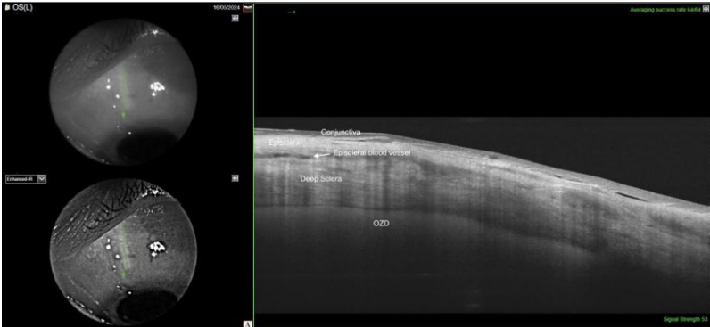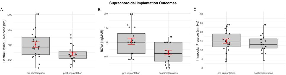 技术方法上,研究采用3D头戴式显示系统(NGENUITY)辅助手术,通过睫状体平坦部3-4mm处的放射状巩膜切口建立脉络膜上腔通路,配合粘弹剂分离空间后植入药物。术后通过扫频OCT(DRI OCT)验证植入位置,主要评估中央视网膜厚度(CRT)、最佳矫正视力(BCVA)和眼压(IOP)变化。