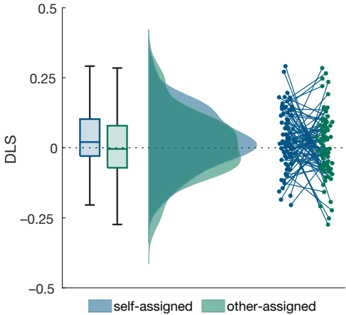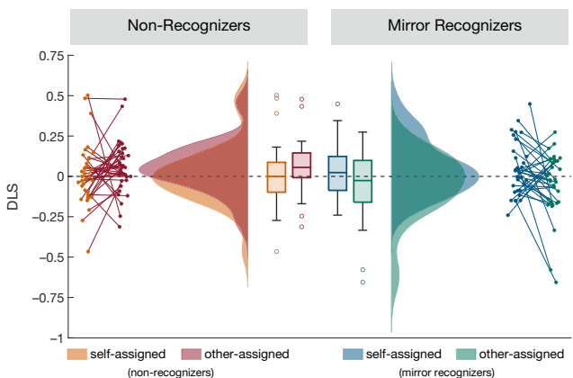 20-40月龄幼儿(均为镜像识别者)复制了自我分配物体的熟悉性偏好(DLSself>0, BF10=6.77),而对其他分配物体无此效应。值得注意的是,这种自我参照优势在20个月后保持稳定,与年龄无相关性(Kendall's tau B=-0.073),表明自我概念一旦形成,其记忆效应即达到平台期。
