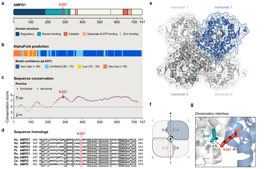结构生物学分析揭示,K287I突变破坏了AMPD1二聚体界面关键盐桥(图2)。这种结构改变可能影响四聚体组装,进而削弱酶活性。人群数据分析发现,该突变与欧洲人群中常见的AMPD1无义突变(C34T)类似,均与静脉曲张风险增加相关(OR=1.03-1.06)。值得注意的是,AMPD1缺陷个体在极端运动条件下表现受损,meta分析显示携带功能缺失突变使成为精英运动员的概率降低约50%。