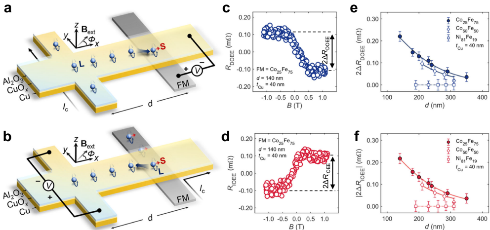 研究人员通过非局域测量技术,首次实验验证了轨道Edelstein效应(OEE)的Onsager互易关系,解决了轨道角动量(OAM)与电荷转换机制难以量化的问题。研究发现轨道积累的横向衰减长度达100 nm(室温),且与Cu厚度无关,为轨道电子学器件设计提供了新思路。成果发表于《Nature Communications》。
