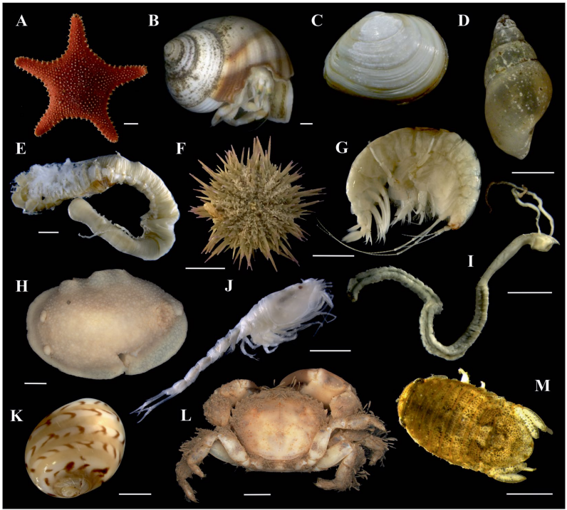 研究团队采用多管齐下的技术路线:首先基于7国监测数据建立1016种的目标物种清单;通过船载采样(使用Van Veen抓斗等设备)获取新鲜标本;采用Chelex快速提取与商业试剂盒相结合获取高质量DNA;选用COI-5P片段(658bp)作为标准条形码区域,针对不同类群优化引物组合(如棘皮动物专用引物LCOech1aF1);通过双向Sanger测序确保数据质量。所有序列均经BLASTN比对、氨基酸翻译验证(排除NUMTs假基因),并通过邻接树(NJ)分析进行系统发育验证。