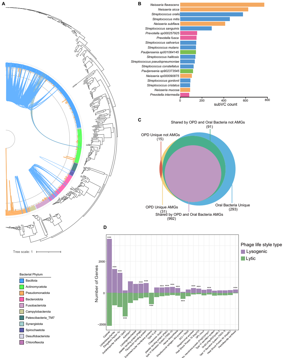 研究采用多组学联用策略:首先通过VirFinder/VirSorter2从670百万条contigs中筛选病毒序列,经CheckV质量评估获得58,141个质量>50%的噬菌体草案基因组;利用vConTACT2构建1915个病毒簇(VCs)和9983个子簇(subVCs);采用CRISPR间隔序列匹配和iPHoP算法预测噬菌体-宿主互作网络;结合ESMFold和Foldseek对52万OPD特异性蛋白进行结构预测;最后通过随机森林模型分析噬菌体与疾病的关联性。