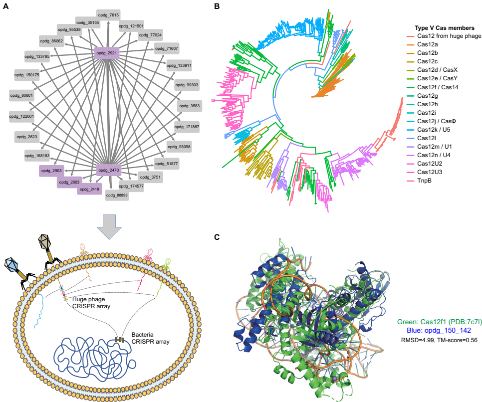 在3232个口腔巨型噬菌体中,265个携带功能性CRISPR-Cas系统。其中opdg_150_142编码的Cas12同源物(465 aa)与古菌Cas12fl结构相似(TM-score=0.56),为新型基因编辑工具开发提供了候选元件。