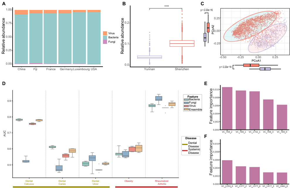 工业化地区(深圳)噬菌体α多样性显著高于农村地区(云南)(p<0.001)。VC_486_17(106 kbp环形裂解噬菌体)等6个核心噬菌体在所有人群中稳定存在,而VC_1377(靶向牙龈卟啉单胞菌)在牙结石患者中特异性富集。