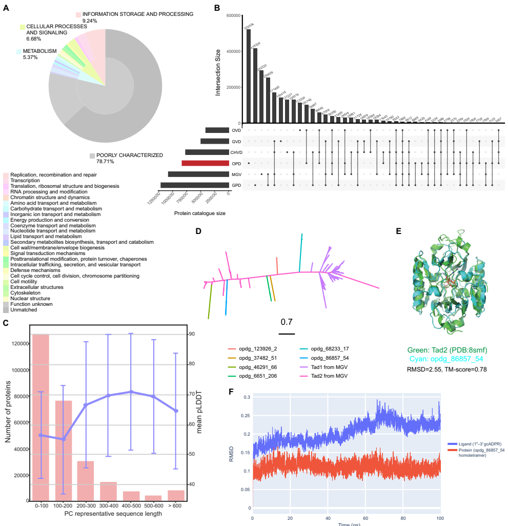 蛋白质组分析显示78.7%的噬菌体蛋白为未知功能"暗物质"。通过结构比对发现6个新型Thoeris抗防御蛋白(Tad2)同源物,其中opdg_86857_54与已知Tad2(PDB:8smf)序列相似性仅20.9%,但结构相似性(TM-score=0.78)和分子动力学模拟证实其可结合1"-3' gcADPR分子,揭示口腔噬菌体存在独特的抗细菌免疫机制。