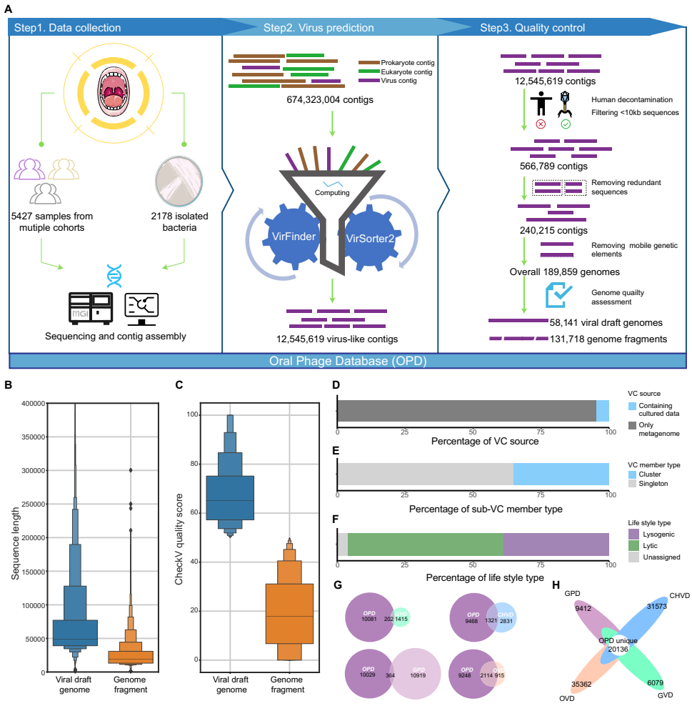 针对这一挑战,来自深圳国家基因库等机构的研究团队在《npj Biofilms and Microbiomes》发表了突破性研究。该团队整合了5427份覆盖中国深圳、云南及欧美多国的口腔宏基因组数据,结合2178株培养口腔细菌基因组,构建了迄今最全面的口腔噬菌体数据库(Oral Phage Database, OPD)。通过创新性地结合宏基因组挖掘、培养组验证和人工智能蛋白质结构预测,不仅揭示了口腔噬菌体的惊人多样性,更发现了其影响宿主健康的全新分子机制。
