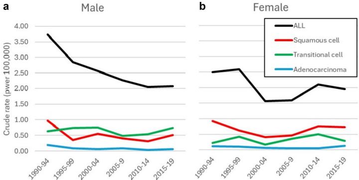 膀胱癌双下降现象:男女发病率分别以1.9%/年和3.8%/年速度下降,但女性发病率仍异常偏高。组织学分析显示过渡性细胞癌(TCC)稳定占50-60%,而鳞状细胞癌(SCC)比例未随血吸虫病防控发生预期变化。