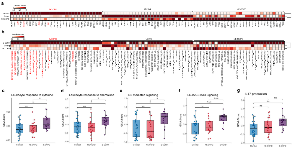 通过转录因子活性分析和基因集富集分析,发现E-COPD中CD4+ T细胞的STAT3、JUN、NFKB和RELA活性上调,炎症通路如IL-6-JAK-STAT3信号、IL-17产生、IFN-γ和TNF反应均增强。这表明E-COPD中CD4+ T细胞处于高度活化的炎症状态。