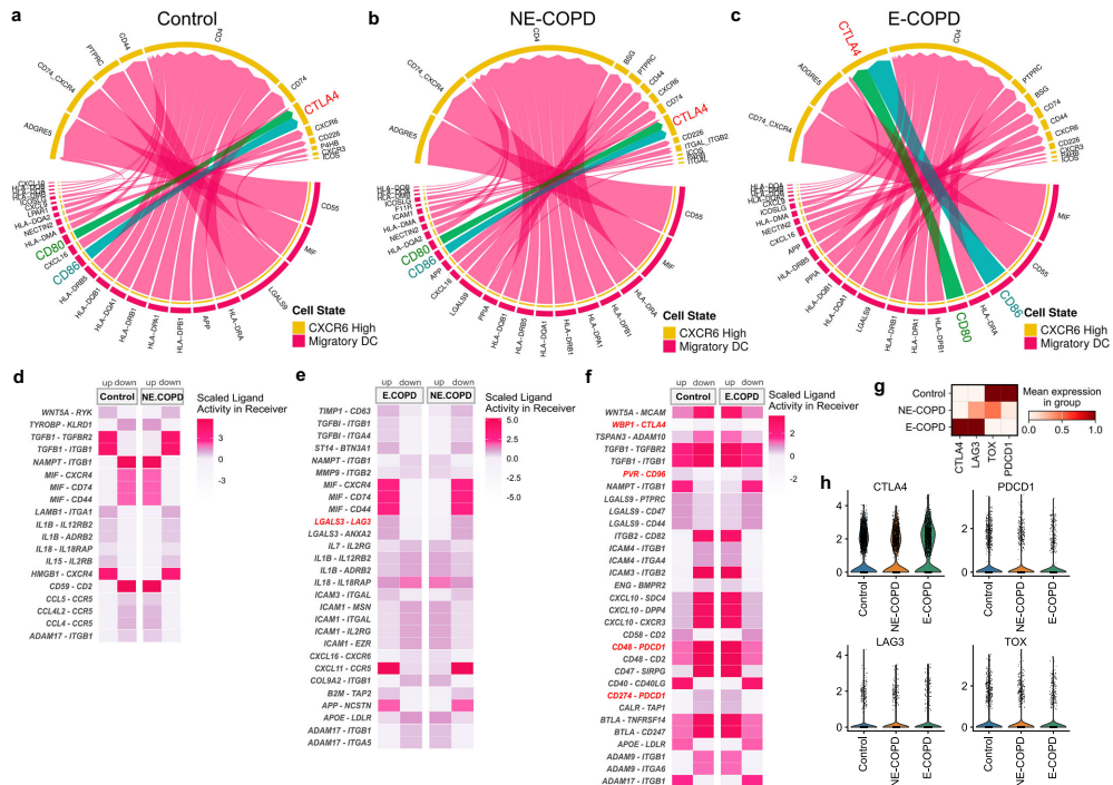 效应记忆CD4+ T细胞中CXCR6high亚群与E-COPD患者肺功能(FEV1%)正相关。该亚群高表达CTLA4等免疫检查点分子,分化程度较低,与迁移性树突细胞通过免疫检查点信号(如CTLA4-CD80/86)互作,可能通过抑制T细胞活化起到保护作用。
