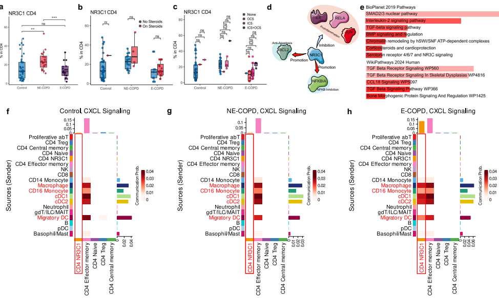 NR3C1+ CD4+ T细胞在E-COPD中相对比例降低,而在NE-COPD中增加,且与糖皮质激素治疗无关。NR3C1抑制IL6、RELA等炎症靶点,其缺失可能导致炎症失控。互作模型预测E-COPD中巨噬细胞与NR3C1+ CD4+ T细胞通过CXCL信号发生强烈互作。