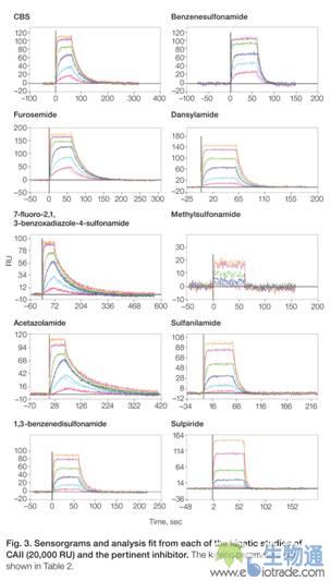 首先将CAII蛋白标记在GLH芯片上。采用氨基偶联,将CAII蛋白用pH 5.0的NaAc溶解,标记在芯片上,可达21,200 RU。待基线稳定后再上小分子抑制剂溶液。待反应全部结束后,用ProteOn Manager软件分析结果。这些小分子抑制剂的名称、分子量、反应最高浓度和结果等信息见下表,反应曲线见下图: