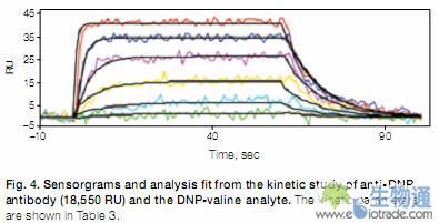 名称 MW ka (1/Ms) kd (1/s) KD (M) Rmax (RU) DNP-glycine 241 1.99×106 0.095 4.77×10-9 36 DNP-valine 283 1.24×106 0.098 7.90×10-8 41 DNP-tryptophan 370 7.14×105 0.251 3.52×10-7 75