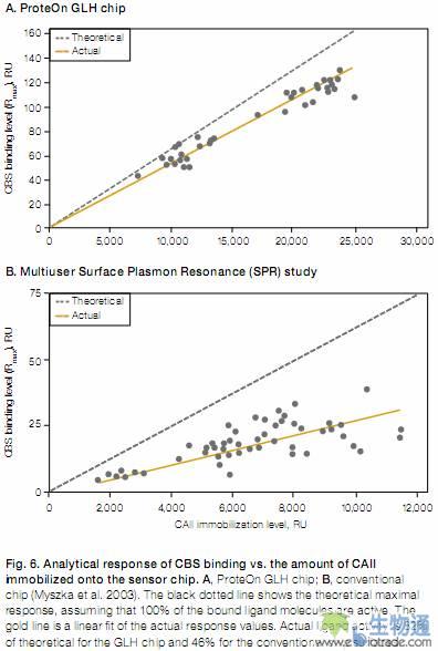 在小分子化合物检测中,作为ligand的蛋白活性对于检测的灵敏度影响非常大。很多人在做SPR实验的时候往往都会忽视这个问题,因为许多实验都不像SPR对蛋白活性如此敏感。在上面两个实验中,如果蛋白活性丧失超过1/2,很难想象还如何检测到这么小分子量的化合物。可问题在于,氨基偶联几乎不可避免地会造成蛋白活性的降低,主要原因可能是部分蛋白的活性位点被芯片上的基质所覆盖。为此,我们又设计了一个实验,就是根据许多化合物和CAII相互作用的Rmax值,推算GLH芯片上有活力的蛋白信号,最后和标记时直观看到的标记信号做一个比较,就可以计算出蛋白标记后的活力占总蛋白的比例。