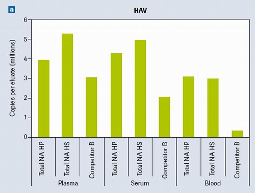 图1:不同样品类型的病毒核酸回收率。 举例显示了HAV和EBV的结果。新的“总NA HS”和“总NA HP”方法的分离效率与最佳对照方法相似。柱状图显示了通过定量(RT-)PCR计算的分离拷贝数差异。每个柱形显示了4倍复制的平均值。在所有情况下,“总NA HS”方法或与对照方法处于相同范围,或显著优于对照方法。