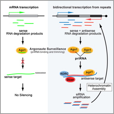这些研究结果表明,细胞中的转录监控与RNA降解产物-Ago1诱导的激发siRNA产生功能有关。