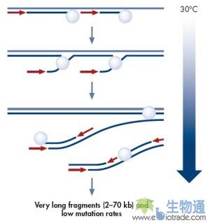 多重置换扩增(MDA)技术的过程如下:引物(箭头所示)与模板DNA退火,并利用在DNA模板链上移动的Phi 29聚合酶在30°C延伸,取代互补链,同时自身成为复制的模板。与PCR扩增不同,MDA不需要不同的温度,且最终的片段非常长,突变率低。
