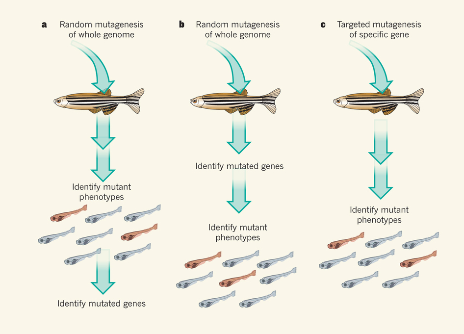 Figure 1 表型与基因的联系。斑马鱼中常见的三种研究特定基因在机体表型中功能的方法。a, 正向遗传学,向成年鱼中引入随机突变,在子代中鉴定表型变异,分析基因组以寻找突变基因。b, 另一种方法是先进行随机突变,但接下来对子代全基因组序列比对以寻找突变,进而确定表型的改变。c, 针对特定靶基因的突变技术,向某个特定的基因引入突变再分析子代的表型。