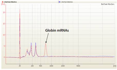 比较经Globin-Zero(下图蓝色曲线)和Ribo-Zero(下图红色曲线,为Epicentre公司产品,去除真核生物的核糖体RNA)处理同一样本的Bioanalyzer结果,表明Globin-Zero可以完全去除球蛋白mRNA。