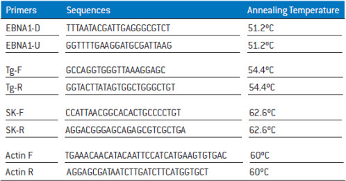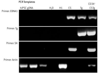 Figure5 Lonza诱导的hiPSCs无外源性的DNA残留。收集三个hiPSCs细胞系的gDNA, 转染2天后收集pEB-c5-transfected CD34+细胞。用三对PCR引物进行扩增(EBNA1, Tg, SK),actin 作为阳性对照。来自hiPSCs的细胞未扩增出外源性的DNA片段。从左到右PCR模板依次为hiPSCs gDNA, 水作为阴性对照, hESC H1的gDNA, pEB-c5,pEB-Tg, 共转染了pEB-C5和Tg的CD34+细胞的gDNA。