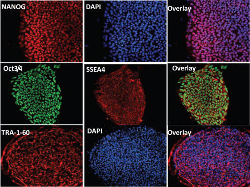 用免疫细胞组化的方法检测诱导成的hiPSCs细胞多潜能标志分子的表达。细胞用4%的多聚甲醛固定,透化后用anti-SSEA4抗体 (Milipore, cat. no. MAB4304), anti-TRA-1-60 抗体[Millipore, cat. no. MAB4360], anti-OCT3/4 抗体 [Abcam, cat. no. 19857] 和anti-NANOG 抗体 [R&D Systems, cat. no. AF1997]进行标记。用Alkaline Phosphatase Kit II (Stemgent, cat. no. 00-0055)检测细胞碱性磷酸酶活性。