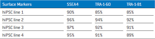 表2 来自于两组实验的4个hiPSCs细胞系流式检测多潜能标志,平均阳性率为85%以上。