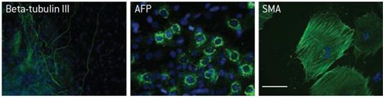 Figure3 Lonza诱导成的hiPSCs能分化成三胚层的细胞类型。从左到右依次为Beta-tubulin III阳性的神经元(绿色)、AFP阳性细胞(绿色)以及SMA阳性细胞(绿色)。DAPI:蓝色;Scale bar 100μm。