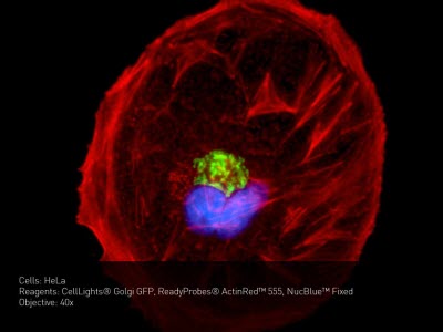 试剂:CellLight®Golgi GFP(绿色)、ReadyProbes® ActinRed 555(红色)、NucBlue® Fixed(蓝色)