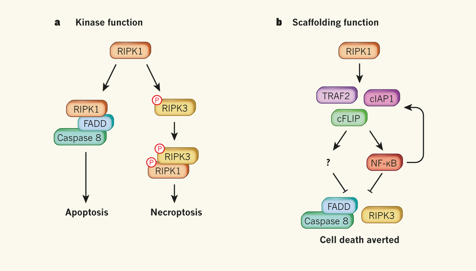 图解:蛋白RIPK1驱动细胞死有两条途径:激活FADD–caspase-8蛋白复合体引起凋亡,或者通过磷酸化的RIPK1和RIPK3互作导致坏死性凋亡。RIPK1诱导细胞死亡的这些过程需要其激酶活性。然而,RIPK1也能促进细胞生存。RIPK1在肠道上皮细胞的保护作用不需要激酶活性,与维持TRAF2、cIAP1和cFLIP的蛋白活性和水平有关(可能是通过防止它们被降解)。RIPK1的这种功能可能涉及了NF-κB信号通路,但似乎也能不依赖NF-κB起作用。