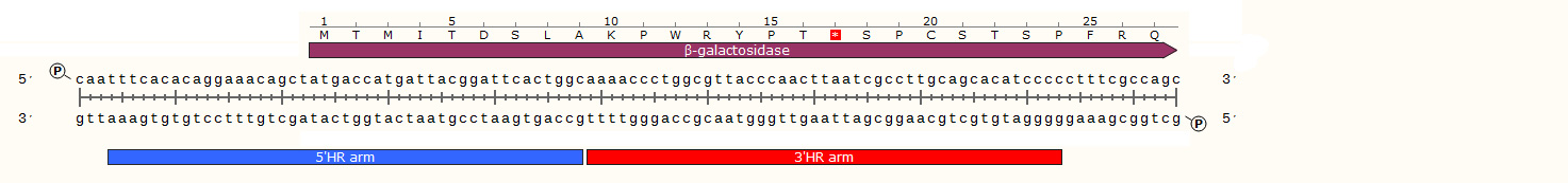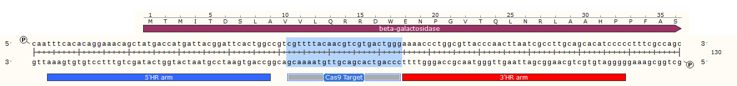 根据BL21中β-半乳糖苷酶基因序列,设计基因敲除靶点和重组修复模板。