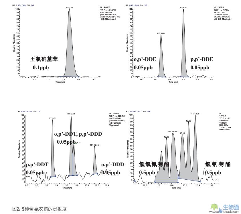 采用逐级稀释的方法检测TSQ Quantum XLS的灵敏度,最终检测出各化合物的最低检测限如图2所示。所有的有机氯农药的最低检测限在0.05-0.5ppb之间。由于采用5MS色谱柱,o,p’ -DDT和 p,p’ -DDD未完全分开,但是从结果看,并不影响最低检测限处的峰强度。如果需要进一步实验,可以采用1701类中等极性的色谱柱,这两种化合物可以完全分开。