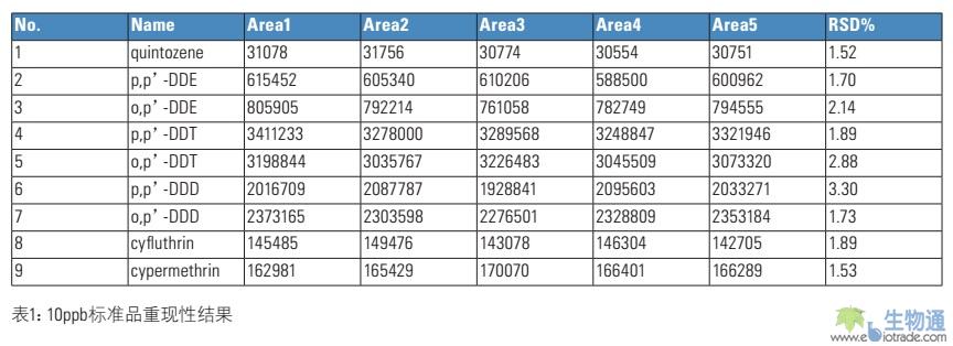 本实验用TSQ Quantum XLS结合高惰性的弱极性色谱柱分析有机氯农药和拟除虫菊酯类农药,得到了非常出色的结果。基质样品的最低检测限在0.05-0.5ppb之间,在1ppb-500ppb的范围有良好的线性,且在基质加标样品连续5针进样的RSD%在1.52%-3.30%。