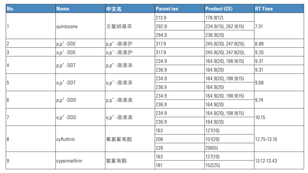 气相色谱三重四极杆质谱TSQ Quantum XLS用于9种有机氯农药和拟除虫菊酯类农药的检测分析