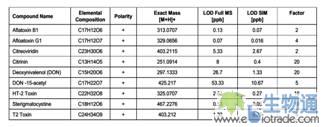 本文建立了运用高分辨质谱对粮食中真菌毒素的筛查和定量方法。Q Exactive Focus 凭借其高达70,000(FMHW@m/z 200)的分辨率和良好的质量精度可以很好的排除复杂基质中的干扰,实现方法的高特异性;凭借其快速的正负极性切换能力,可在一针分析内同时完成对正负离子的检测,实现方法的高通量,在实现高灵敏度的同时,还能通过数据依赖的二级全扫描对结果进行确证,可以很好满足食品安全的定量分析需求。