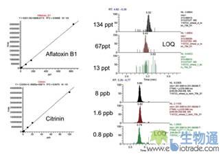 图3. Aflatoxin B1(黄曲霉毒素B1)和Citrinin(橘霉素)小麦提取物基质加标的标准曲线和不同浓度水平的SIM 扫描色谱图