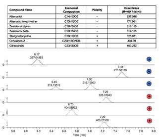 真菌毒素是真菌在食品或饲料里生长所产生的代谢产物,对人和动物都具有极大的健康隐患。据联合国粮农组织(FAO )统计,全球每年约有25% 的农产品受到真菌毒素污染。为了保证食品和饲料的安全,全世界多个国家通过法规或标准严格规定粮食中主要真菌毒素的限量。但传统的检测方法存在耗时长,通量低,定性能力差等问题。本文采用高分辨台式质谱仪 Q Exactive Focus 建立了粮食提取物中多种真菌毒素的检测方法。方法具有媲美高端三重四极杆的灵敏度,同时可以对复杂基质中的痕量物质准确地定性分析,充分保障结果的准确性。
