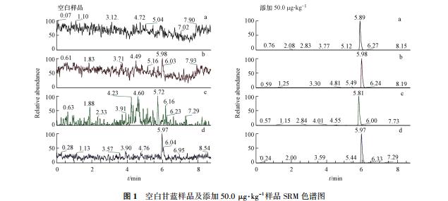 为消除基质效应的影响,本实验采用空白基质液加标的混合标准工作液,选用甘蓝、油麦菜空白基质溶液,添加混标溶液配制 1—50 ng·mL-1范围的标准工作液,上机测定,以浓度为横坐标,测试物峰面积为纵坐标绘制标准曲线,在 1—50 ng·mL-1浓度范围内各组分均呈良好的线性.以目标物在空白样品中 3 倍信噪比计算检出限:氟虫腈 0.5 μg·kg-1、氟虫腈硫醚 0.1 μg·kg-1、氟虫腈砜 0.1 μg·kg-1、氟甲腈 0.1 μg·kg-1.甘蓝空白样品及添加样品中氟虫腈及其代谢物的 SRM 数据见图 1.