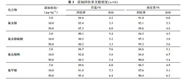 采用本方法检测市售的甘蓝和油麦菜各 10 份,结果均未检出氟虫腈及其代谢产物农药残留.
