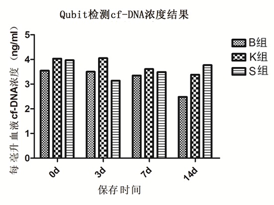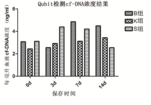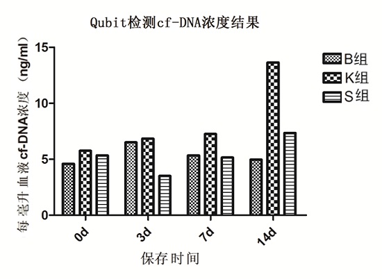 图4Qubit结果显示:三种保存管7天内保存效果无明显差异,14天时,K组与S组保存管均出现明显的上升,分别是第0天的15.27倍和10.21倍,21天时,上升最为明显,分别是第0天的22.46倍和13.84倍。B组保护剂保存的血液在第0、3、7、14、21、28天检测时,每毫升血液cf-DNA浓度均无明显的上升。
