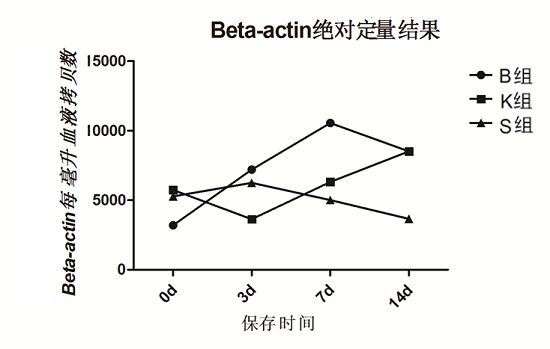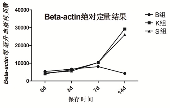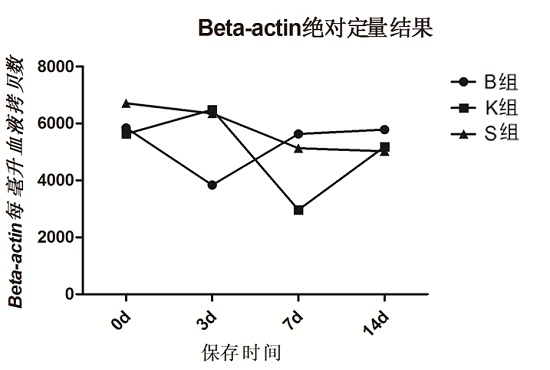 图7 Beta-actin结果显示:在4°C情况下,三种保存管0-14天的每毫升血液Beta-actin拷贝数并无明显的差异。