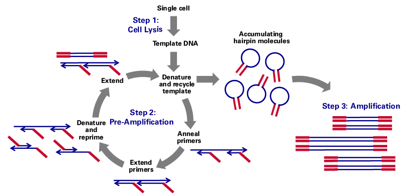 在经过细胞裂解后,以DNA作为模板使用准线性扩增方法进行预扩增,并在每个循环最后形成一个不能被进一步扩增的发夹结构,这样做的好处是有效避免PCR过程中可能引入的扩增错误无限放大,避免序列偏向性。