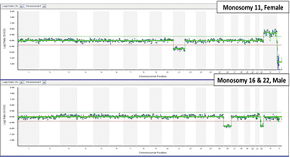 利用单卵裂球活体组织检查样品进行PicoPLEX WGA Kit扩増标记后,与24 sure array杂交,结果清晰地显示了CNV(上图)。2011年ESHRE(欧洲人类生殖与胚胎学会)的临床实验证明了采用PicoPLEX 技术进行人类染色体核型分析的准确性。