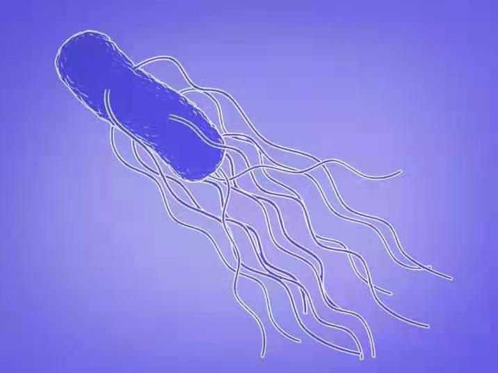 细菌具有这种运动能力是因为拥有独特的运动器官—鞭毛。细菌鞭毛是一个巨大的纳米机器,在结构上由细菌膜上的马达(motor)、胞外的接头装置(hook)和鞭毛丝(filament)组成,横跨细菌的内外膜,延伸到细菌细胞外。鞭毛马达含有质子泵,通过转运氢离子,将化学能转变为机械能。鞭毛马达旋转并将扭矩传输给接头装置,然后传给鞭毛丝,从而带动鞭毛丝的转动。鞭毛丝如同螺旋桨一样,旋转推动细菌向前移动。