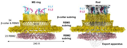 (1)天然状态下内膜环(MS ring)内部存在高度对称错位。内膜环是整个鞭毛马达的组装底座,它不仅可以旋转,而且可以接受来自质子泵和胞质区环传来的扭矩,并将扭矩传给联动杆(rod),而真实状态下MS ring的对称性长期以来具有争议。文章首次证实了天然状态下MS ring内部存在高度对称错位,其上部β-collar和 RBM3区具有C34的对称性,底部RBM2区采取C23对称性,而顶部伸出10个多肽链(5条L1链和5条L2链)。内膜环底部RBM2区紧紧地卡住分泌装置,β-collar和 RBM3包围分泌装置和联动杆下端。