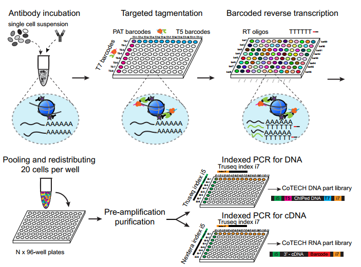 CoTECH方法是在何爱彬研究组早期开发的单细胞ChIP-seq方法CoBATCH1的基础上,巧妙地结合了优化的单细胞RNA-seq技术,实现在单个细胞中,同时捕获特定的组蛋白修饰或者转录因子结合以及转录组(图1)。此外,由于CoTECH方法沿用了组合标签策略,使得CoTECH技术具有普适性,即不借助特殊仪器及不需要构建转基因模型的情况下高通量、高精度地获得单细胞双组学数据,即使在起始细胞数量有限(数千个单细胞)的情况下依然能获得很高的数据质量,能够满足大多数的研究需求。值得一提的是,与CoTECH技术相关的UCSD任兵团队报道的Paired-Tag方法,基于Split-pool和多轮连接,从几百万个细胞起始,从而实现单细胞组蛋白修饰与转录组检测2。