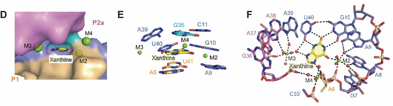 为了阐明黄嘌呤核开关识别其配体的原理以及其对嘌呤代谢通路的调控作用,任艾明课题组利用X-射线晶体学的方法,解析了来自Ideonella sp. B508-1中的黄嘌呤核开关与黄嘌呤的复合物结构(图C)。复合物的三维结构显示,黄嘌呤核开关RNA整体折叠为一个紧凑的长杆状I形构象,茎区P1,P2a,P2b在三维空间中连续堆积形成长的螺旋轴。两个Junction(J1,J2)通过G35和C11之间的Watson-Crick配对形成远程相互作用,稳定了黄嘌呤核开关的整体结构。配体结合口袋处于茎区P1和P2a之间的连接区,其中黄嘌呤与G10和U40作用形成一个三碱基层,该三碱基层被进一步夹在两个三碱基对A39-G35-C11和A6-U41-A9之间,成为长螺旋轴的重要组成部分(图D, E)。此外,结构中还发现,黄嘌呤结合位点附近存在三个金属离子Mg2+(M2,M3,M4),它们通过直接作用或者配位水分子的介导,与配体黄嘌呤以及形成结合口袋的核苷酸形成广泛的氢键相互作用,进而稳定结合口袋的形成(图F)。基于结构,我们对结合口袋中的关键碱基进行了特异性突变,随后通过ITC亲和力测定以及2-Ap修饰RNA 分子的荧光光谱分析,进一步验证了黄嘌呤核开关对黄嘌呤特异性识别的结构特征。