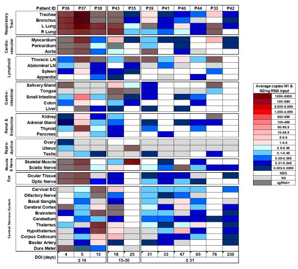 美国NIH领导的一项研究,对44例感染COVID-19后死亡的患者进行了完整的全身和脑取样的尸检,证明即使是无症状感染者和轻症感染者体内也广泛分布着SARS CoV-2病毒,病毒全身性的复制能够发生在感染早期。发病后,病毒RNA在肺外组织和大脑内续存最长超过230天。
