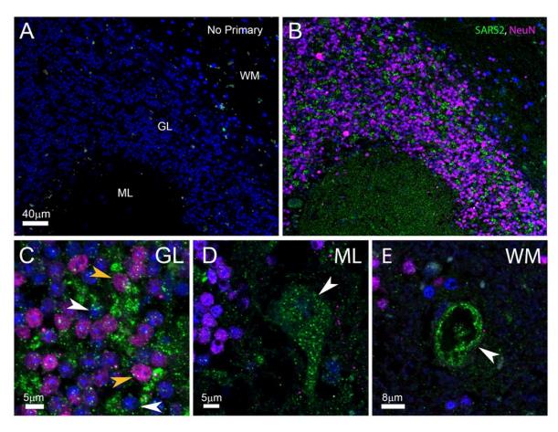 小脑切片免疫组化显微观察在小脑的分子层、颗粒层和白质中都发现了SARS-CoV-2病毒蛋白。