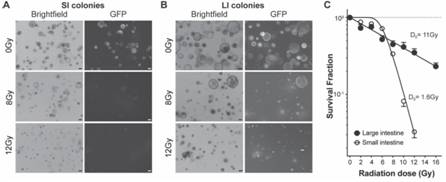 集落不同辐照下的表型分析;(C) 小肠和大肠干细胞集落的剂量生存曲线。