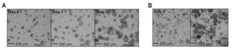 图2 牛结肠类器官的建立。A.结肠类器官在0-3天的生长状态;B.传代培养的类器官的生长状态。