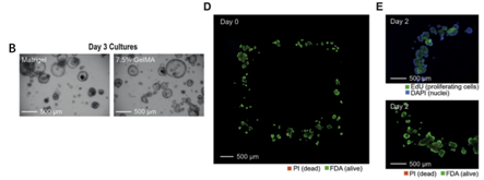 类器官生长状况;D.打印后1小时的类器官活性;E.打印后48 h的增殖情况。